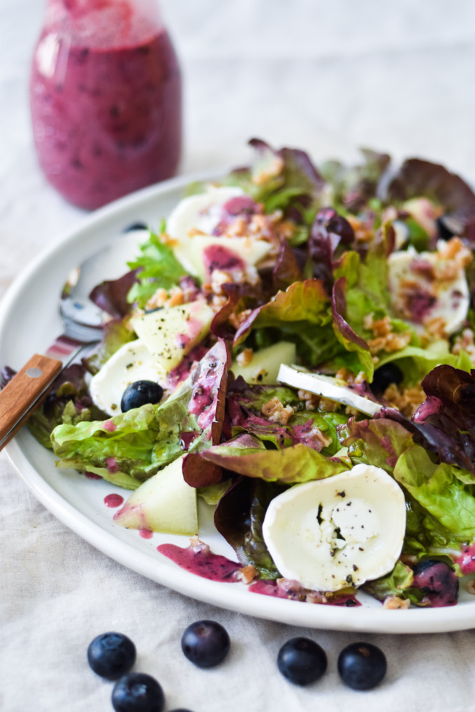 This recipe features a real summer salad and a beautiful blueberry vinaigrette that is bursting with flavour. It is one of my favorite summer salads and I love serving it for guests, as it really lights up a dinner or lunch table.