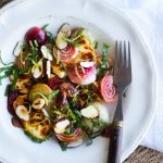 Sweet candy striped beets with salty halloumi