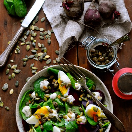 This healthy beetroot salad with spinach, egg and capers mayonnaise dressing is definitely one of my favorite salads. The combination of beetroot with a creamy capers mayonnaise is just so good. Actually you can also use the capers mayonnaise in a sandwich, its really great or you can even mix it together with some potatoes and lots…