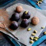 - Form small balls with your hands and dip them in melted dark chocolate and top each date ball with a pistachio nut.