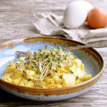This egg salad is a typical Danish lunch dish that we just love in my family. It goes great with marinated hearing or just in an open faced sandwich – preferably rye bread. We eat this all year around, but especially during Christmas and Easter time. The mustard sprouts are home grown, and they go extremely well together with this egg salad.